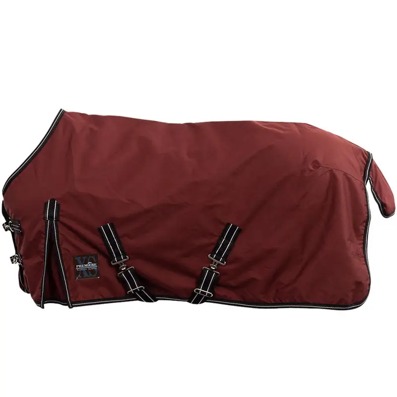 De Premiere regendeken XS Oxblood Red is een waterdichte regendeken vervaardigd uit 600 Denier ribstop polyester. De deken is gedeeltelijk met katoen gevoerd in combinattie met glad polyester materiaal op de schouders om schuurplekken te voorkomen. De deken is voorzien van dubbele verstelbare voorsluitingen met wuick release, verstelbare kruissingels, lieskoorden en staartflap.