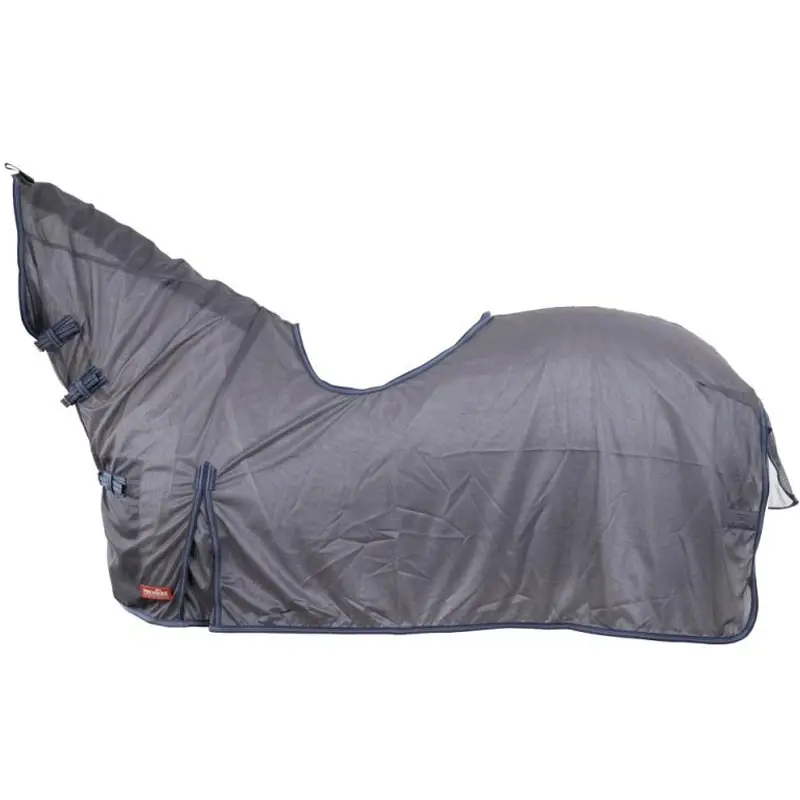 Vliegenuitrijdeken van het merk Premiere vervaardigd uit een fijnmazige mesh stof. Het borstgedeelte en het bovenste gedeelte van het halsttuk zijn met 190T nylon gevoerd ter voorkoming van schuren. De deken is voorzien van een lus voor bevestiging aan het hoofdstel, halssluiting met dubbele klittenbandsluiting, enkele verstelbare borstsluiting, loopsplitten, elastische verstelbare lieskoorden en staartflap.