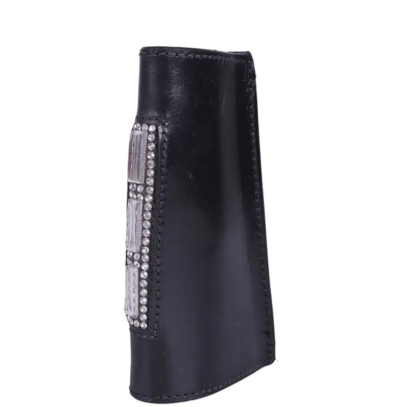 Lederen beugelriemhoesjes model Taylor van het merk QHP afgewerkt met rechthoekige en ronde strass steentjes.