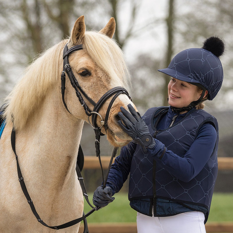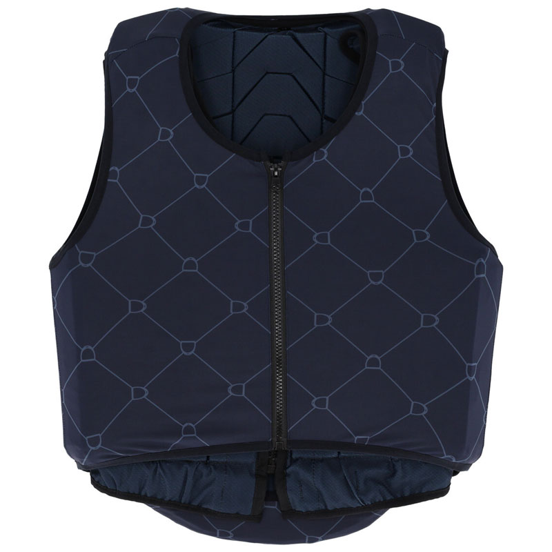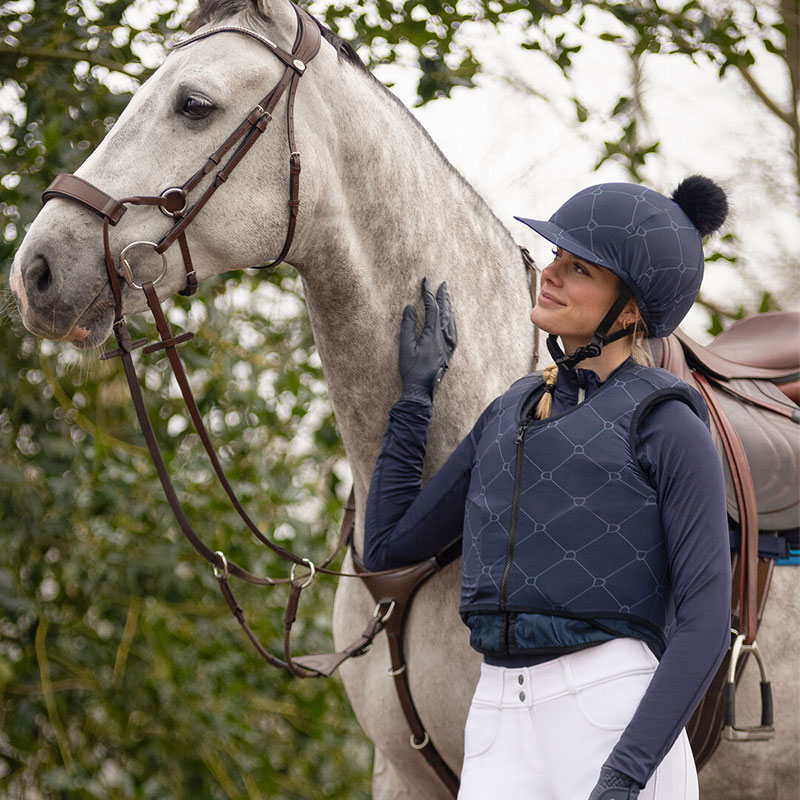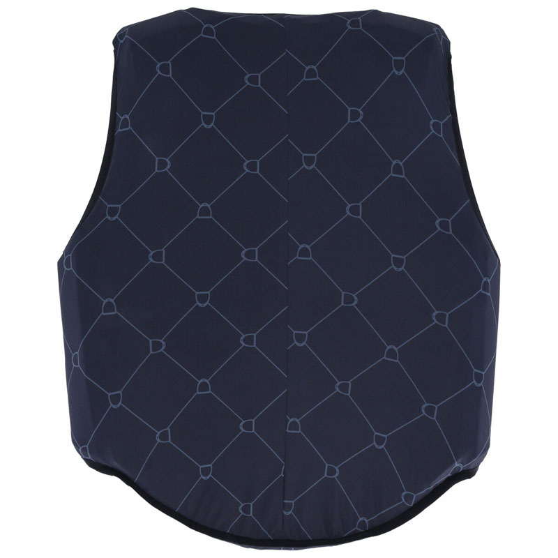 QHP Bodyprotector Cover Liora Navy. Een elastische cover met een goede aansluitende pasvorm geschikt voor de QHP bodyprotectors. Afgewerkt met een allover stijgbeugel print.