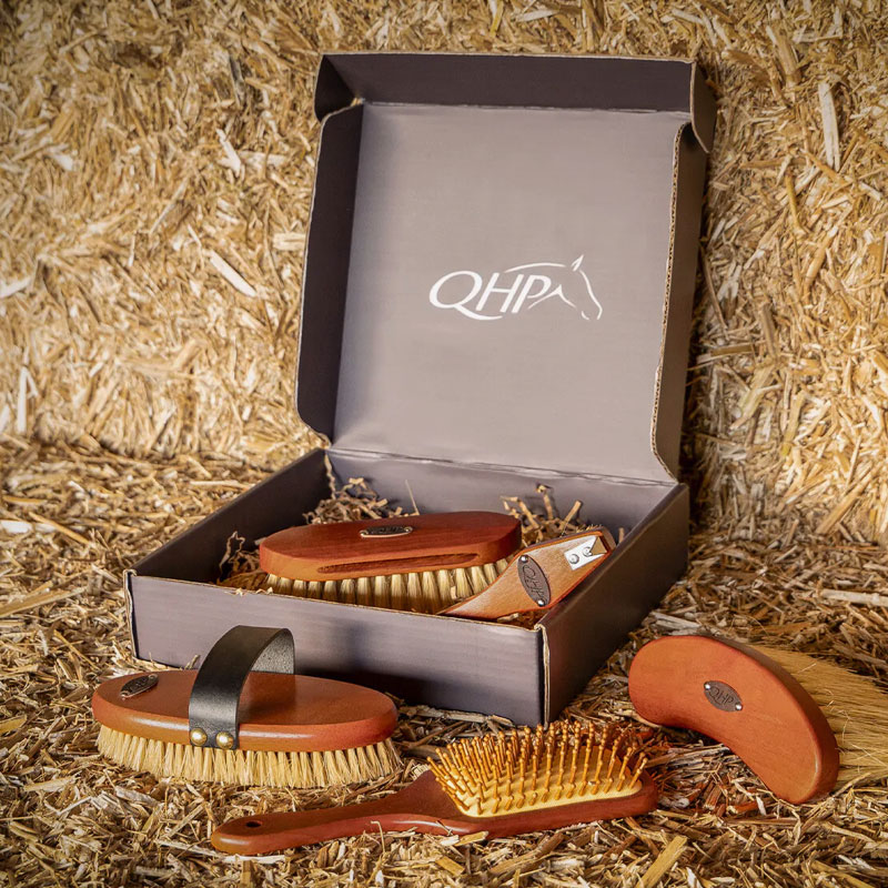 De QHP borstelset Royal Donkerbruin biedt 5 luxe borstels voor de verzorging van je paard. Deze borstels zijn een belangrijk onderdeel van de verzorgingsroutine van je paard. Gemaakt met materialen zoals duurzaam tampico, een natuurlijke vezel, zorgen ze voor een zorgvuldige en zachte reiniging van de vacht.