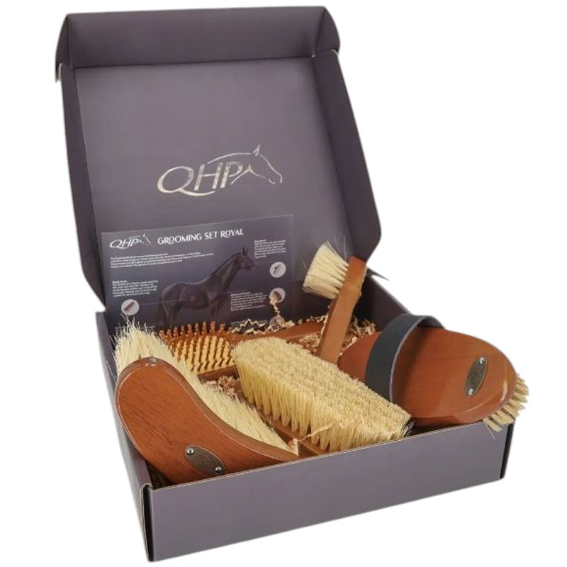 De set bestaat uit een harde borstel, een zachte borstel, een middelzachte borstel, een manenborstel en een hoevenkrabber met borsteltje. De Royal groomin set is perfect om cadeau te geven of om je paard te verwennen en de verzorgingsroutine te upgraden.