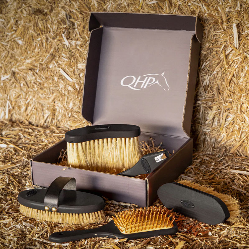 De QHP borstelset Royal Zwart biedt 5 luxe borstels voor de verzorging van je paard. Deze borstels zijn een belangrijk onderdeel van de verzorgingsroutine van je paard. Gemaakt met materialen zoals duurzaam tampico, een natuurlijke vezel, zorgen ze voor een zorgvuldige en zachte reiniging van de vacht.