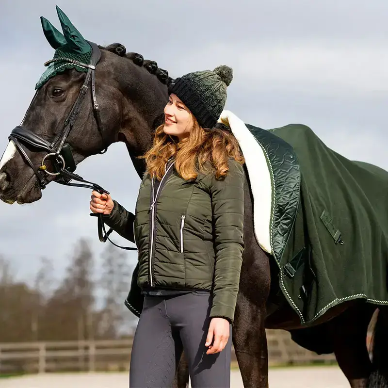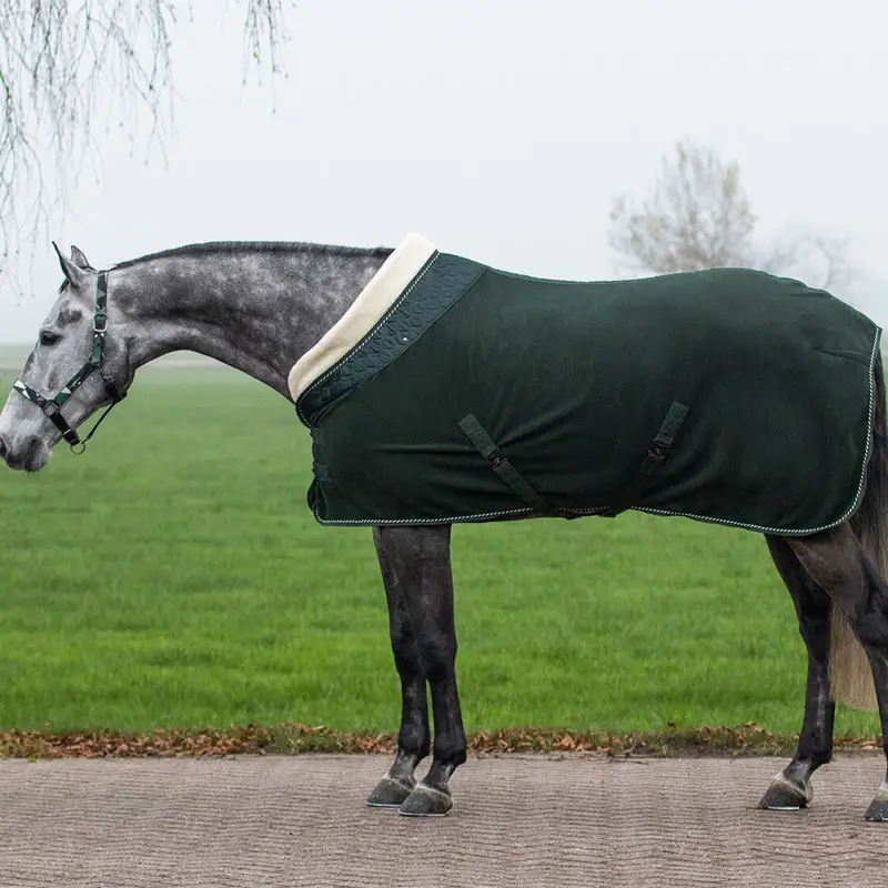 De QHP fleecedeken Brilliance Deep Forest heeft een brede luxe kraag gemaakt uit satijn in combinatie met imitatiewol. De deken is gemaakt uit 250 gsm zacht fleece wat zorgt draagt voor de zweetopname. De deken is voorzien van dubbele koppelsluiting op de borst, afneembare kruissingels en staartkoord.