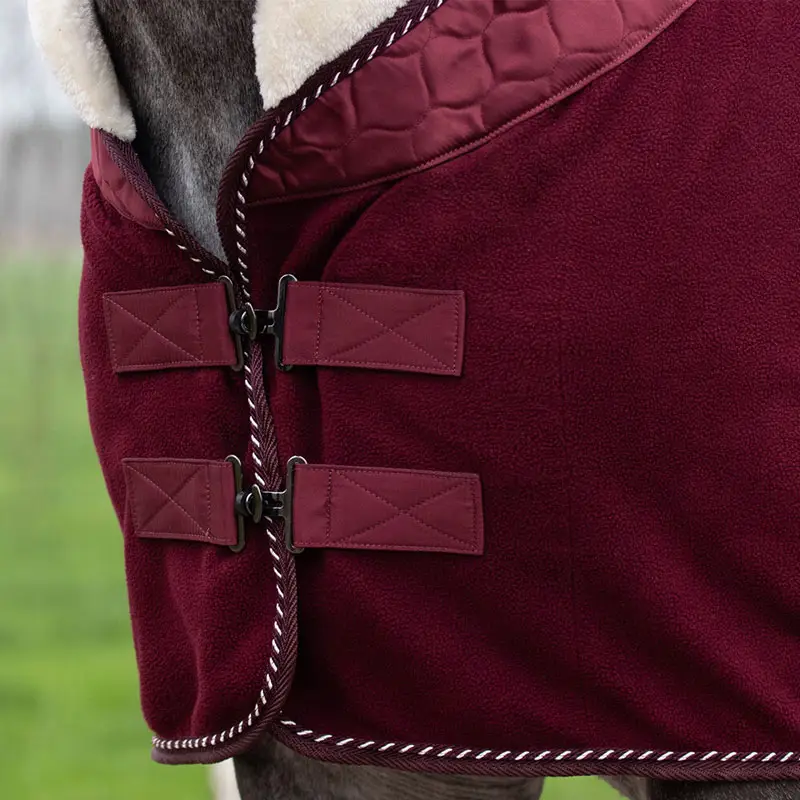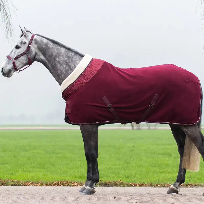 De QHP fleecedeken Brilliance Porto Red heeft een brede luxe kraag gemaakt uit satijn in combinatie met imitatiewol. De deken is gemaakt uit 250 gsm zacht fleece wat zorgt draagt voor de zweetopname. De deken is voorzien van dubbele koppelsluiting op de borst, afneembare kruissingels en staartkoord.