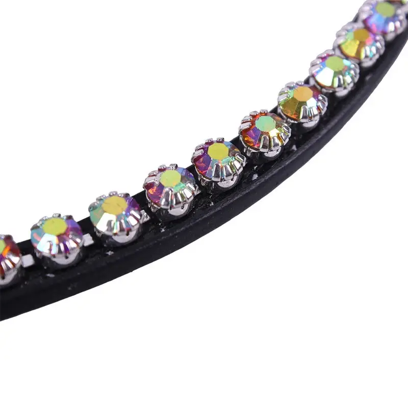 Gebogen model lederen frontriem van het merk QHP afgewerkt met grote strass stenen gezet met meerkleurige glinstering.