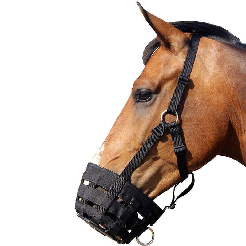 De uitsparingen in het masker zorgen ervoor dat het paard gewoon kan grazen, maar waardoor er aanzienlijk minder gras gegeten kan worden.