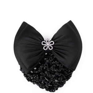 Satijnen haarstrik van het merk QHP afgewerkt met grofmazig haarnetje voorzien van bloem met strass steentjes. De haarstrik is te bevestigen door het gebruik van een patentspeld aan de achterzijde.