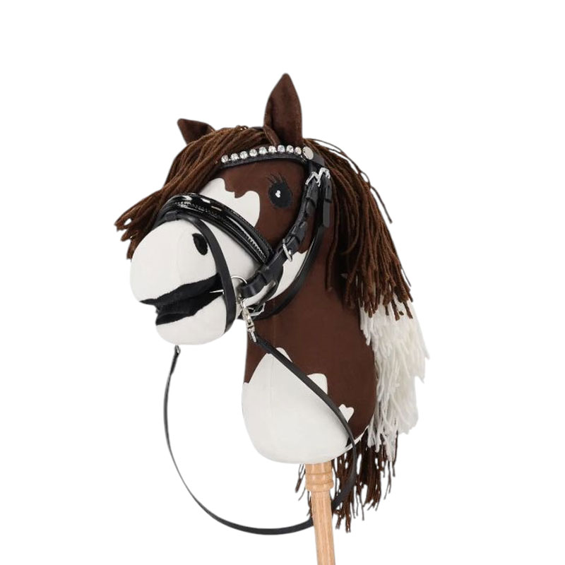 QHP Hobby Horse Hoofdstel Sunset Zwart. Luxe hoofdstel gemaakt uit pvc materiaal in cobminatie met lak en strass steentjes op de frontriem. Het hoofdstel wordt geleverd inclusief bit en teugels.