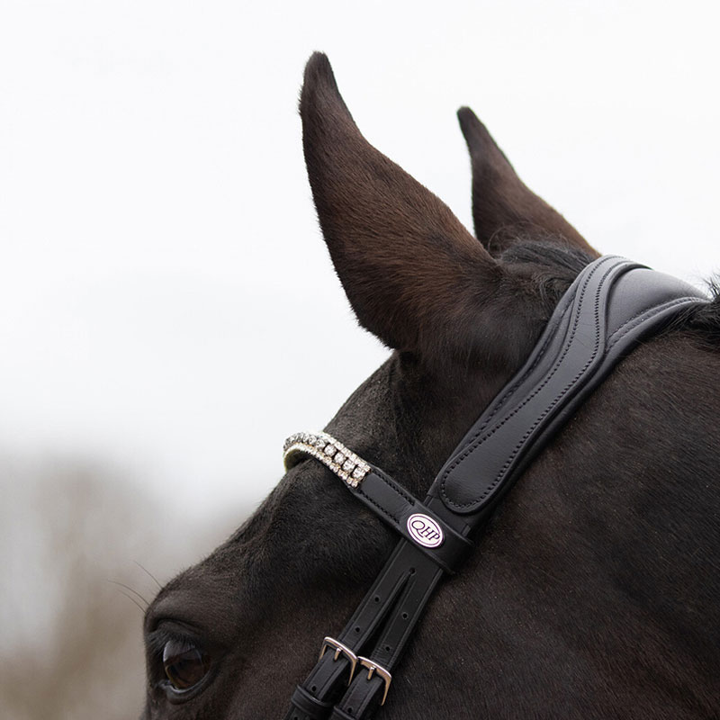 Het QHP hoofdstel Eris zwart is een luxe hoofdstel uitgevoerd met lakleder op de neusriem en Strass steentjes op de “Wave” vormige frontriem. Dit QHP hoofdstel is speciaal ontworpen voor paarden met een gevoelig hoofd. De zenuwen en de gevoelige punten worden met dit hoofdstel zoveel mogelijk vermeden. De neusriem drukt tevens niet tegen de kiezen, waardoor er irritatie rondom de paardenmond wordt voorkomen. Het hoofdstel wordt compleet met bijpassend webband teugels geleverd.