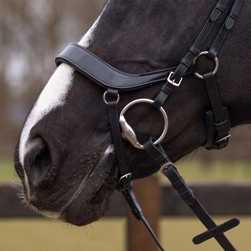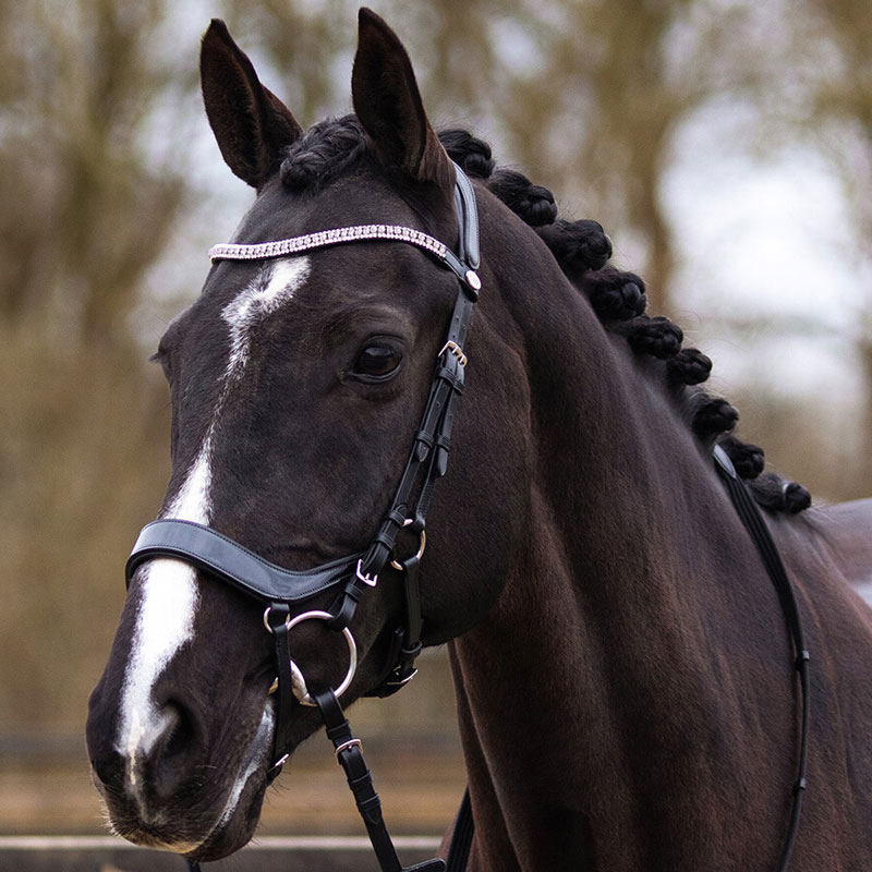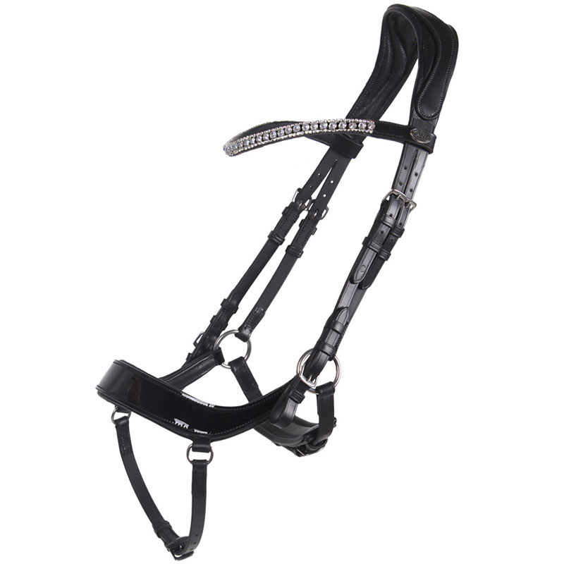 Het QHP hoofdstel Eris zwart is een luxe hoofdstel uitgevoerd met lakleder op de neusriem en Strass steentjes op de “Wave” vormige frontriem. Dit QHP hoofdstel is speciaal ontworpen voor paarden met een gevoelig hoofd. De zenuwen en de gevoelige punten worden met dit hoofdstel zoveel mogelijk vermeden. De neusriem drukt tevens niet tegen de kiezen, waardoor er irritatie rondom de paardenmond wordt voorkomen. Het hoofdstel wordt compleet met bijpassend webband teugels geleverd.