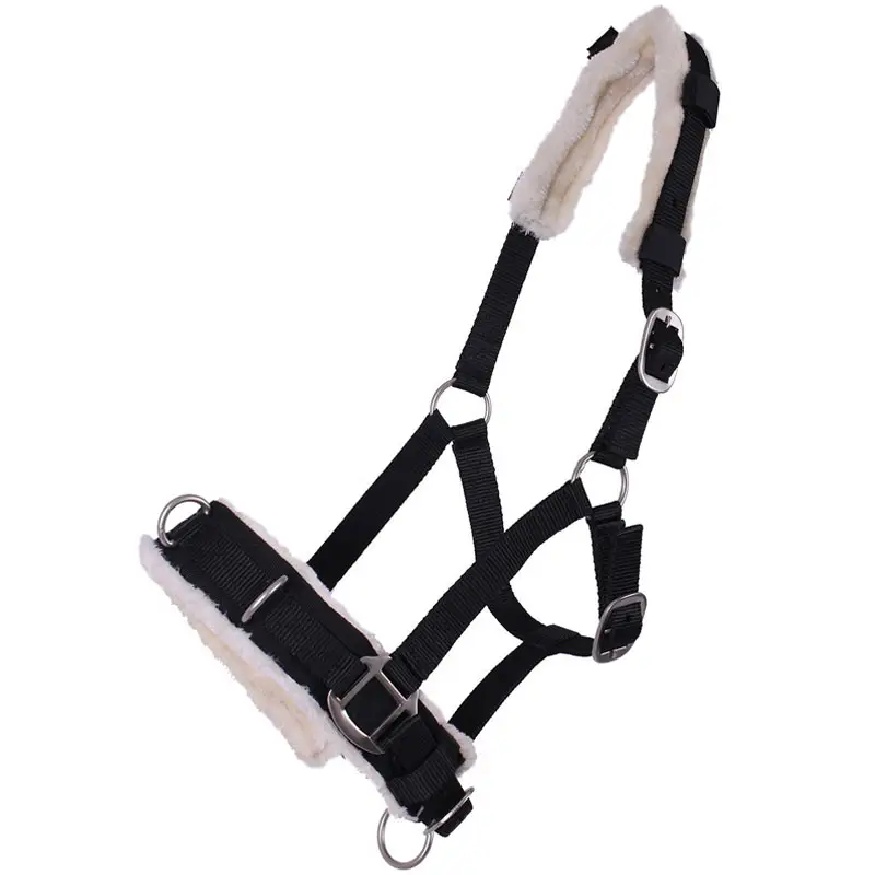 Nylon kaptoom van het merk QHP met drie metalen ringen op de neusriem. De kaptoom is op drie plaatsen verstelbaar en voorzien van bontjes onder de neusriem en onder het kopstuk.
