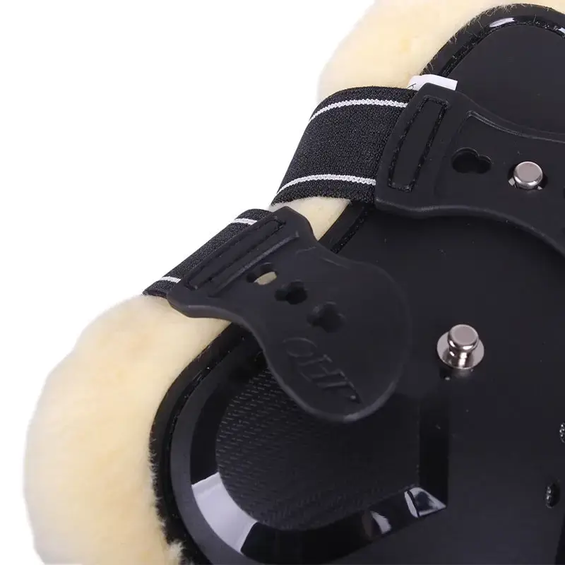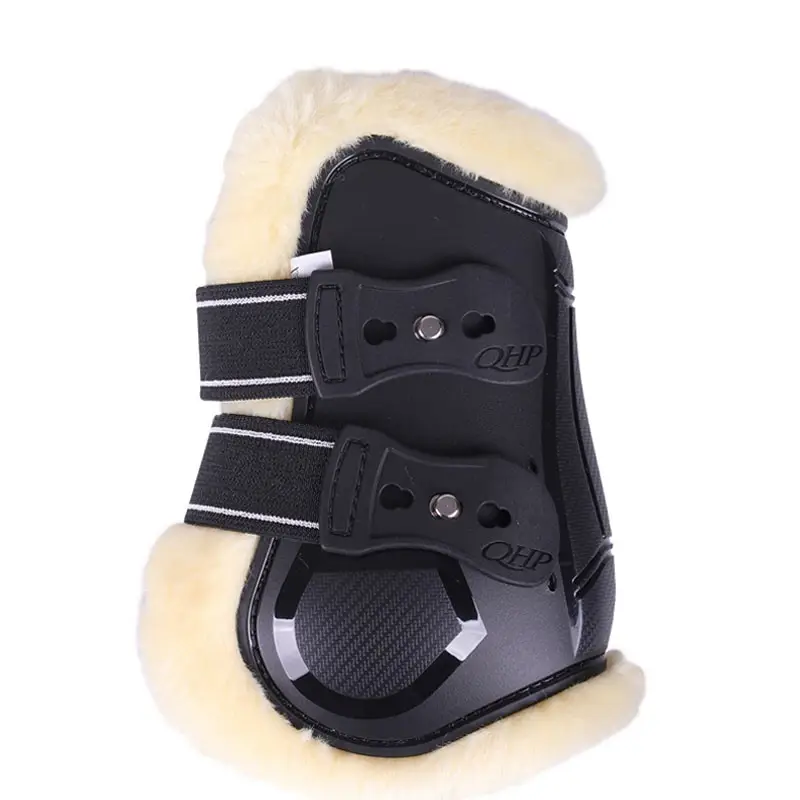Anatomisch gevormde kogelbeschermers van het merk QHP voorzien van imitatiebont voering voor paarden met een gevoelige huid op de benen. De beschermers zijn gemakkelijk te sluiten door elastische knopsluitingen.