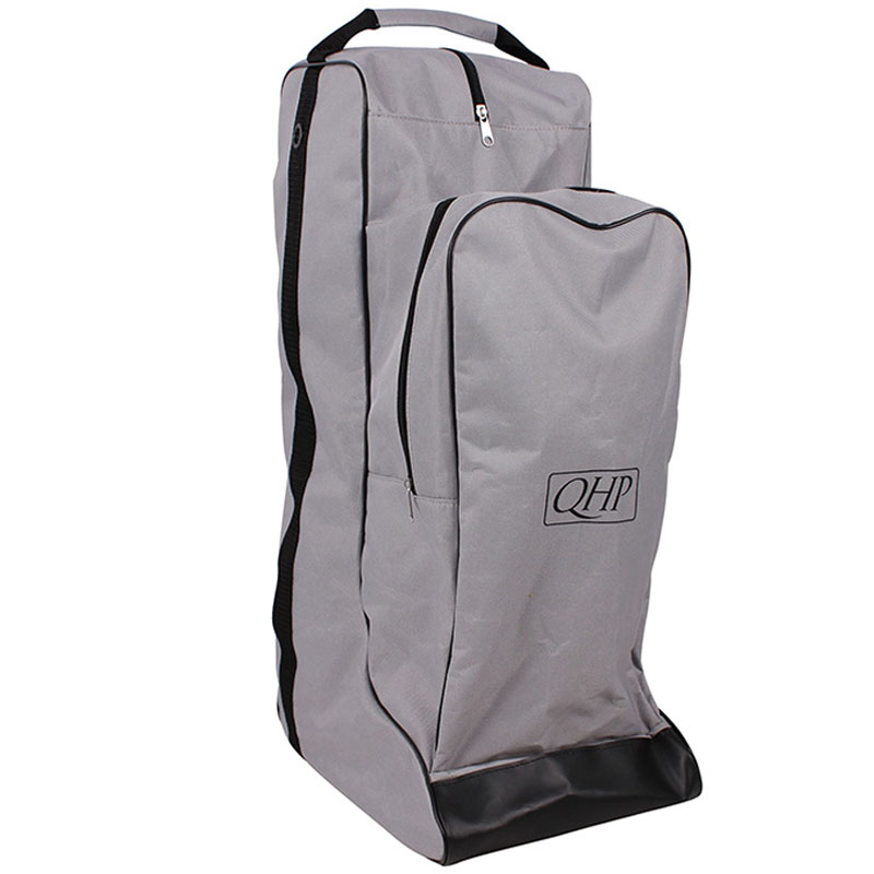 De QHP laarzen/helmtas grijs/zwart is een waterafstotende tas gemaakt uit 600 Denier polyester. De tas is voorzien van gescheiden compartimenten welke te sluiten zijn door middel van ritssluiting. De tas heeft een handvat en kleine ventilatie openingen.