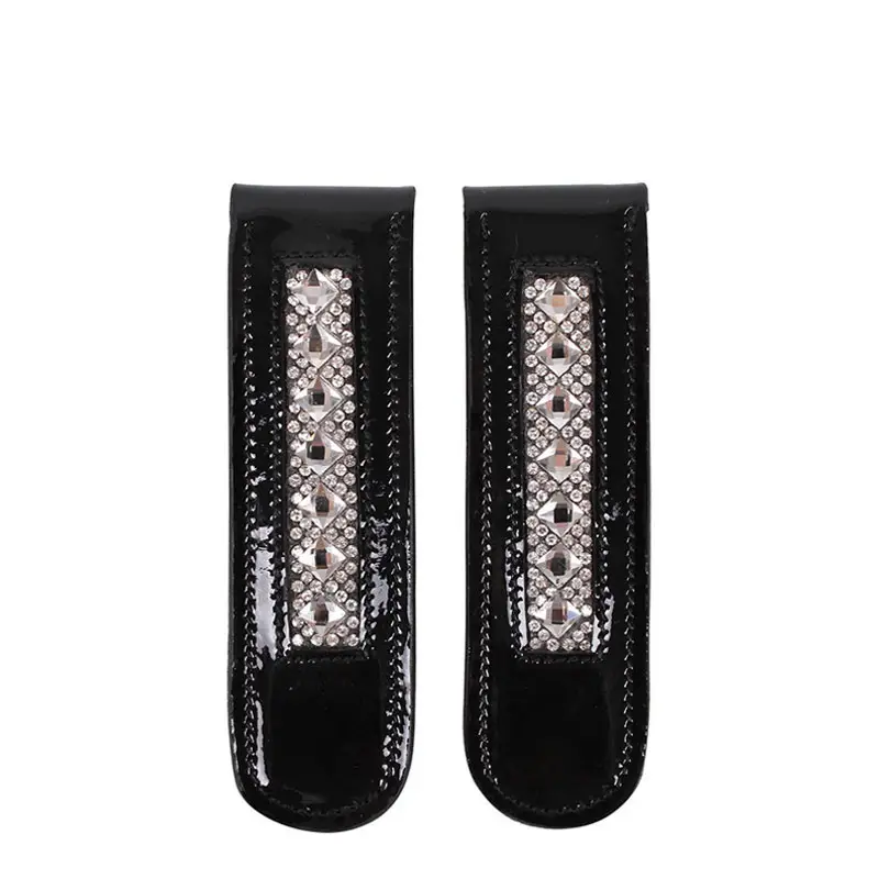 De QHP laarzenclips Sharina Junior zijn afgewerkt in lak leer met ruitvormige en ronde strass steentjes. Met deze laarzenclips van het merk QHP verander je gemakkelijk de uitstraling van je rijlaarzen. Je schuift ze over de buitenzijde van de schacht en je voelt ze niet zitten.
