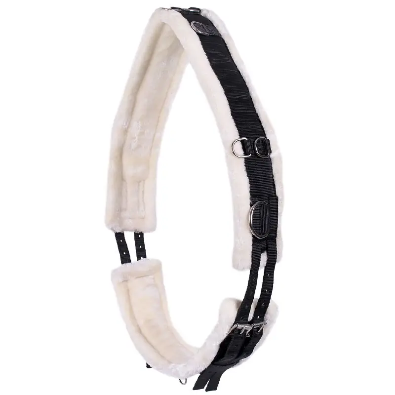 QHP longeersingel Ontario zwart. Longeersingel voorzien van imitatiebont en verstelmogelijkheid aan beide zijde. Deze longeersingel is voorzien van diverse ringen voor bevestiging van eventuele hulpteugels.