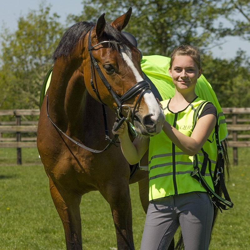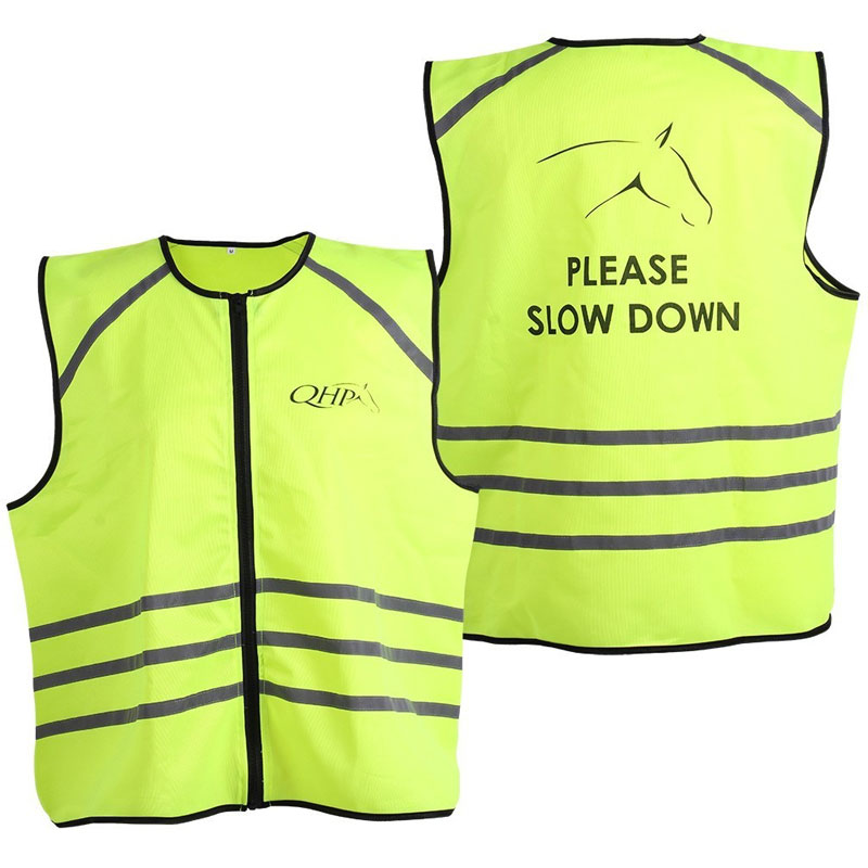 Het reflectie vest voor de ruiter zorgt voor een betere zichtbaarheid zowel overdag als in het donker door de reflecterende strepen op de romp en schouders. De achterkant is voorzien van een “please slow down” tekst en paardenhoofd bedrukking. Het vest heeft een ritssluiting aan de voorkant.