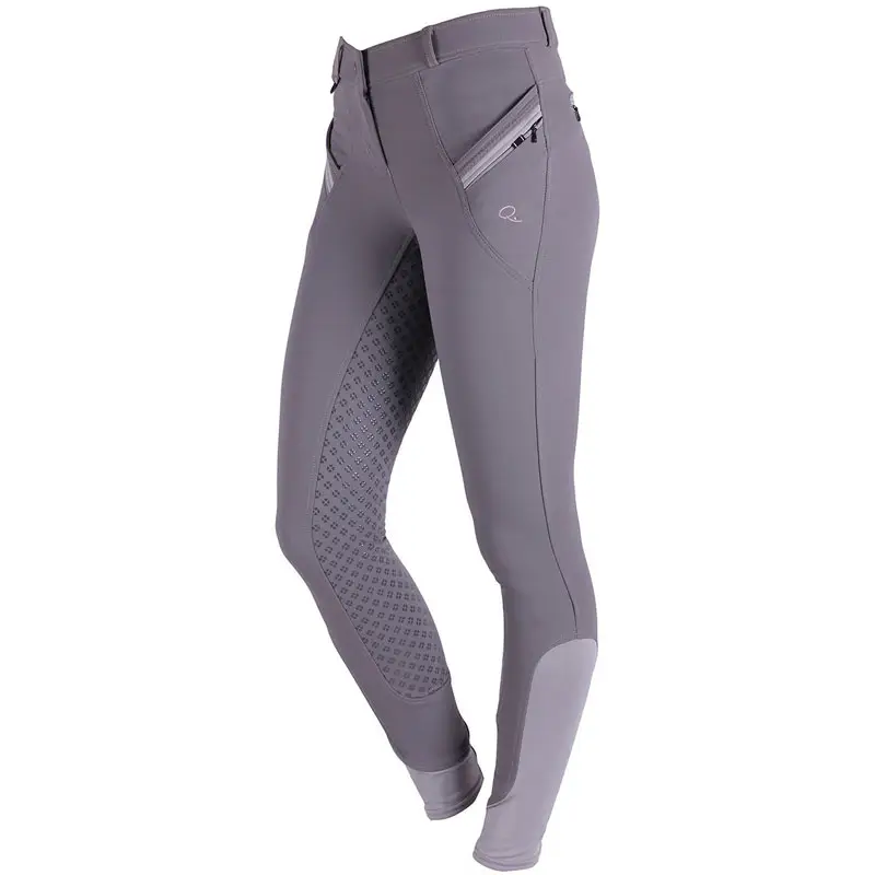 Chique dames rijbroek voorzien van Full Grip zitvlak vervaardigd uit siliconen in het model van een klavertje vier. De rijbroek is afgewerkt met contrasterende pipings langs de zakken voorzien van decoratieve ritssluitingen en geborduurd logo met strass steentje.