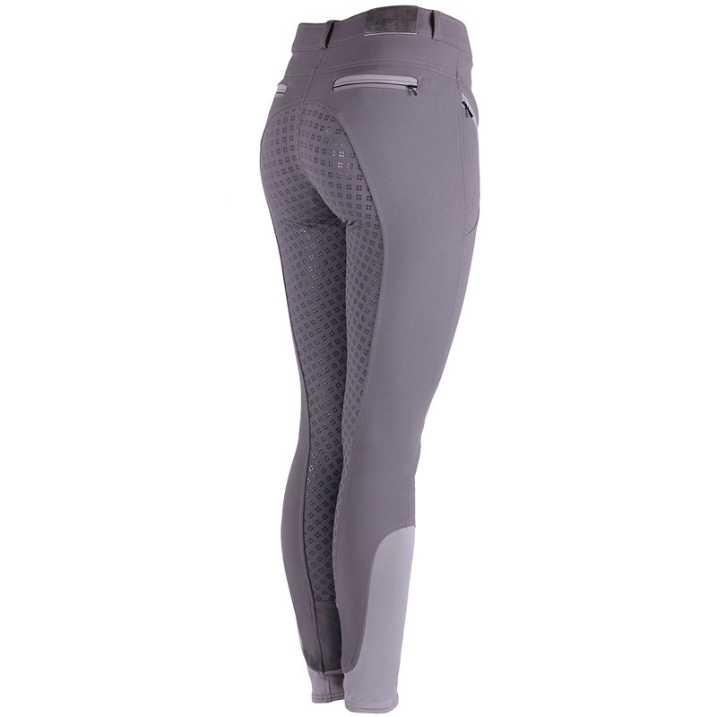 Chique dames rijbroek voorzien van Full Grip zitvlak vervaardigd uit siliconen in het model van een klavertje vier. De rijbroek is afgewerkt met contrasterende pipings langs de zakken voorzien van decoratieve ritssluitingen en geborduurd logo met strass steentje.