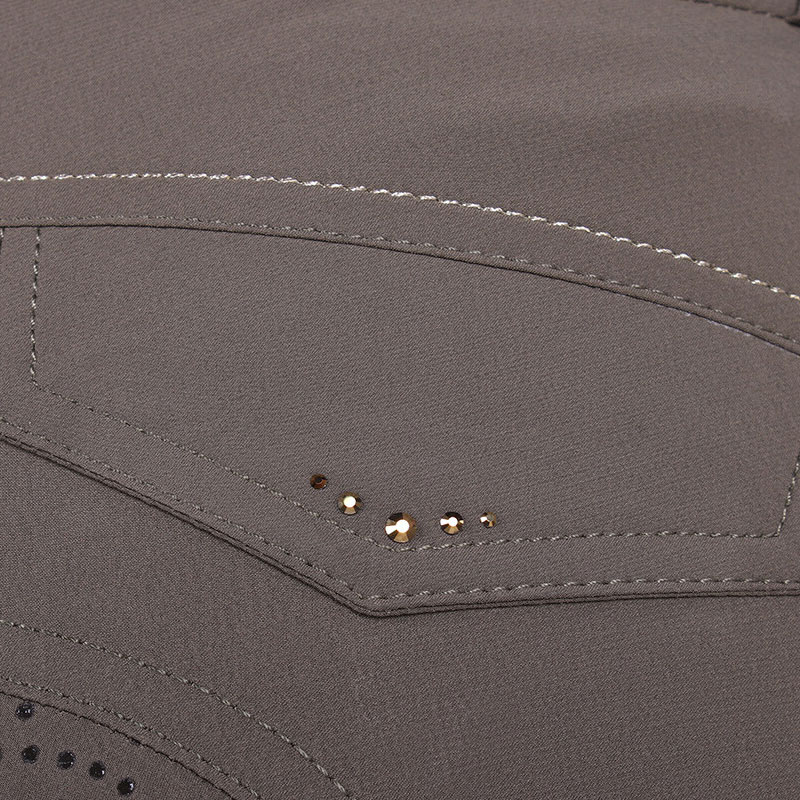 De QHP rijbroek Tara Olijf heeft een hoge tailleband met dubbele sluiting. De rijbroek is voorzien van goudkleurige ritssluitingen op de voorzakken en heeft twee decoratieve zakken aan de achterzijde. De rijbroek heeft tevens een Full Grip siliconen zitvlak voor een optimale grip en elastisch gedeelte bij de enkels voor een gemakkelijke instap.