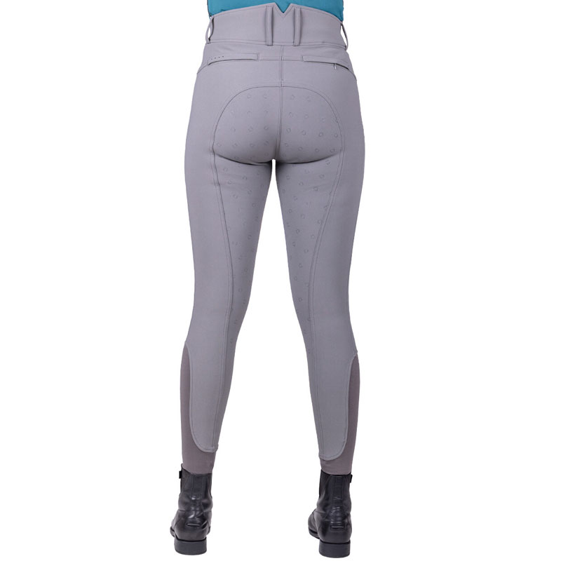 Dames QHP Rijbroek Victoria Full Grip vervaardigd uit vochtabsorberende, zacht aanvoelende en ademende stof. De rijbroek heeft een siliconen Grip zitvlak in stijgbeugel patroon en is afgewerkt met reflecterende tekst op het linkerbeen. De rijbroek is voorzien van verborgen ritszakjes met glitter details aan zowel de voor als achterzijde en heeft elastische afluiting bij de enkels.