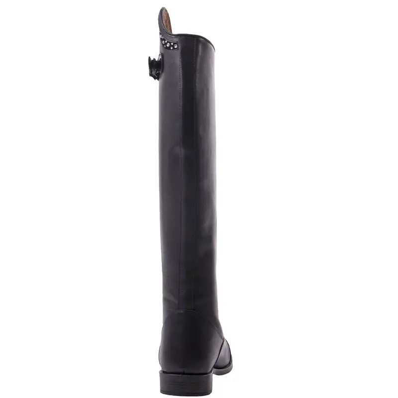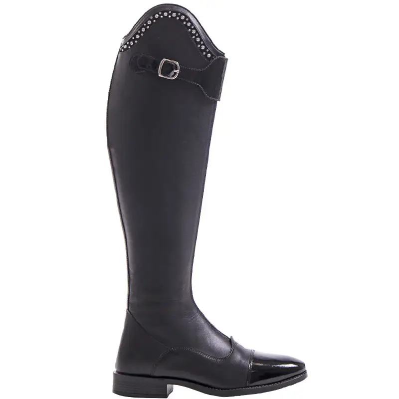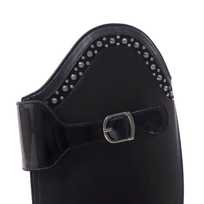 De QHP rijlaars Dorah zwart is vervaardigd uit rundsleer met een lederen voering. De rijlaarzen zijn voorzien van een ritssluiting over de voorzijde in combinatie met een laklederen riempje met gesp als afsluiting aan de bovenzijde. De buitenzijde van de dressuurboog is gedecoreerd met chique strass steentjes.