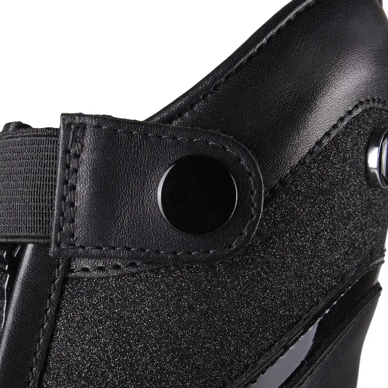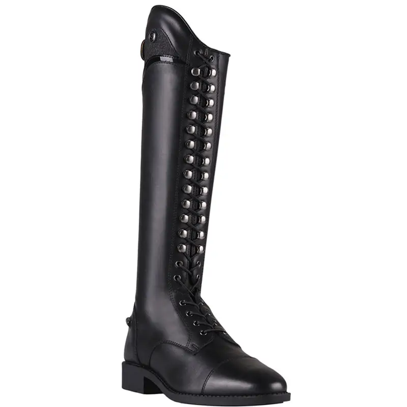 De QHP Hailey Junior zwart is een mooie leren rijlaars voorzien van een elastische vetersluiting aan de voorzijde en een ritssluiting in combinatie met elastiek aan de achterzijde. De boog van deze rijlaars is afgewerkt met glitter in combinatie met lak detail.