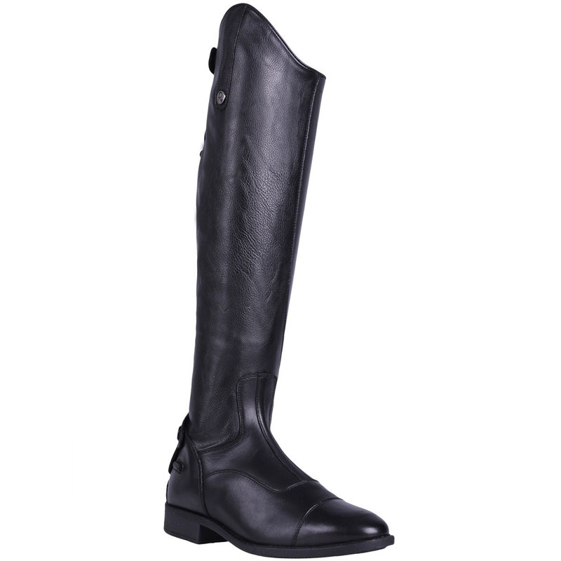 Heren rijlaars model Hugo van het merk QHP. De voet en de binnenzijde van de schacht is gemaakt uit rundsleder en de buitenzijde van de schacht is gemaakt van elastisch synthetisch leder voor het creëren van een optimale pasvorm. Aan de achterzijde van de rijlaars zit een ritssluiting doorlopend tot onder aan de zool samen met spoorhouders.