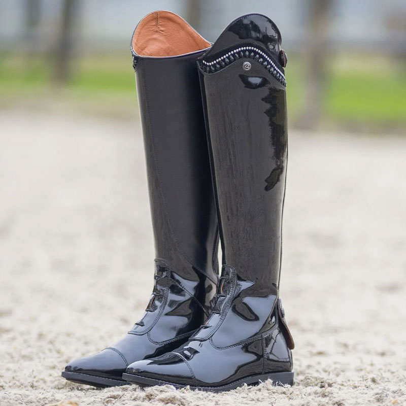 De QHP rijlaars Lamira is een lakleren rijlaars afgewerkt met glitter decoratie aan de buitenzijde van de boog. De elastische vetersluiting op de wreef biedt bewegingsvrijheid rondom de voet en enkel. De rijlaars is voorzien van een ritssluiting aan de achterzijde in combinatie met elastiek gedeelte wat zorgt voor optimaal draagcomfort.