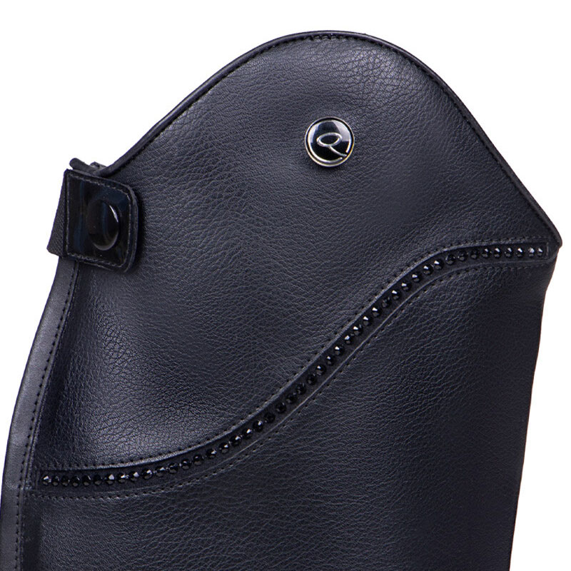 De QHP rijlaars Lyssa is een elegante leren rijlaars voorzien van ritssluiting met elastische inzet aan de achterzijde en een elastische veter op de wreef. De bovenzijde van de rijlaarzen is afgewerkt met een subtiele rij strass steentjes en Q-Pin.