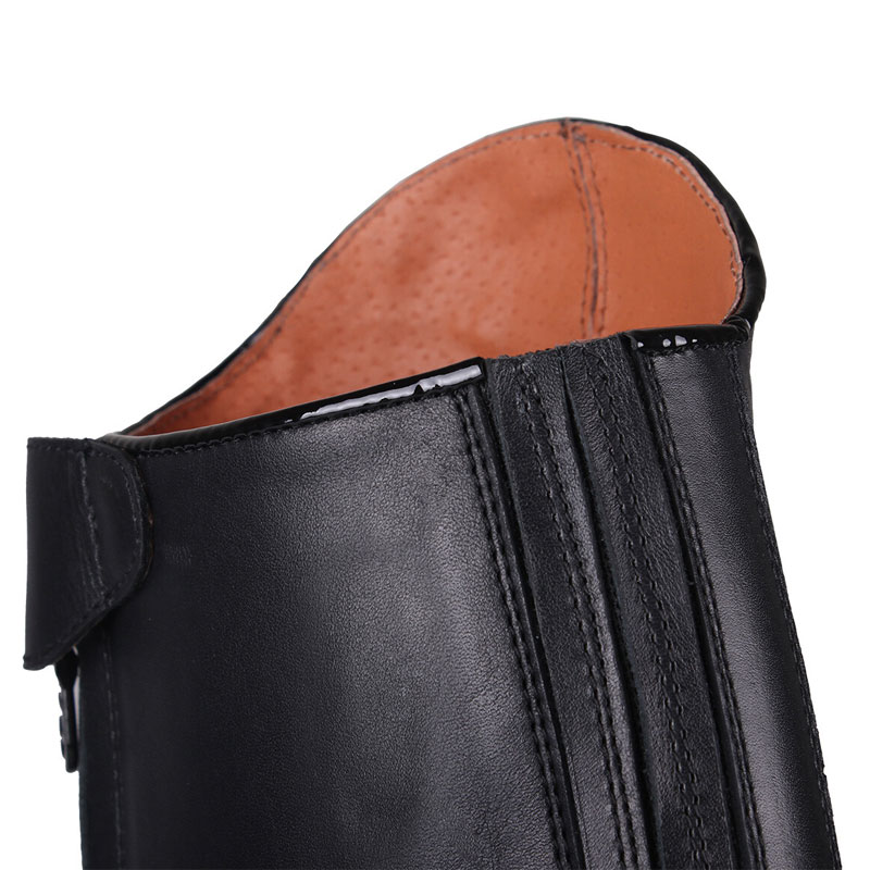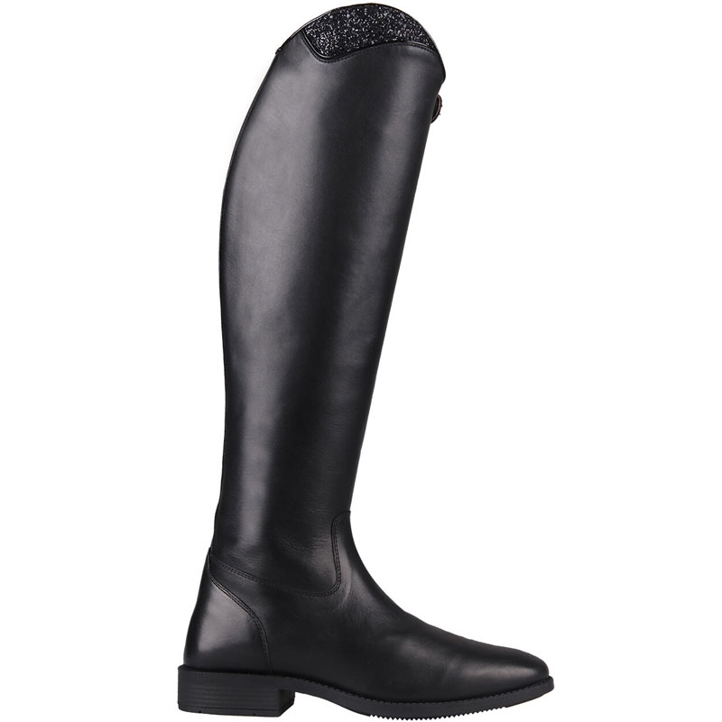 De QHP rijlaars Yuna is vervaardigd uit rundleer met een leren binnenvoering. De rijlaars is afgewerkt met een dressuurboog gedecoreerd met glitters. Aan de binnen/voorzijde is deze rijlaars voorzien van een ritssluiting met elastisch gedeelte aan de achterzijde.