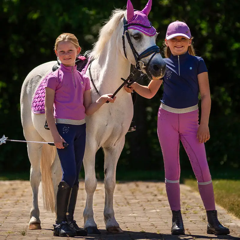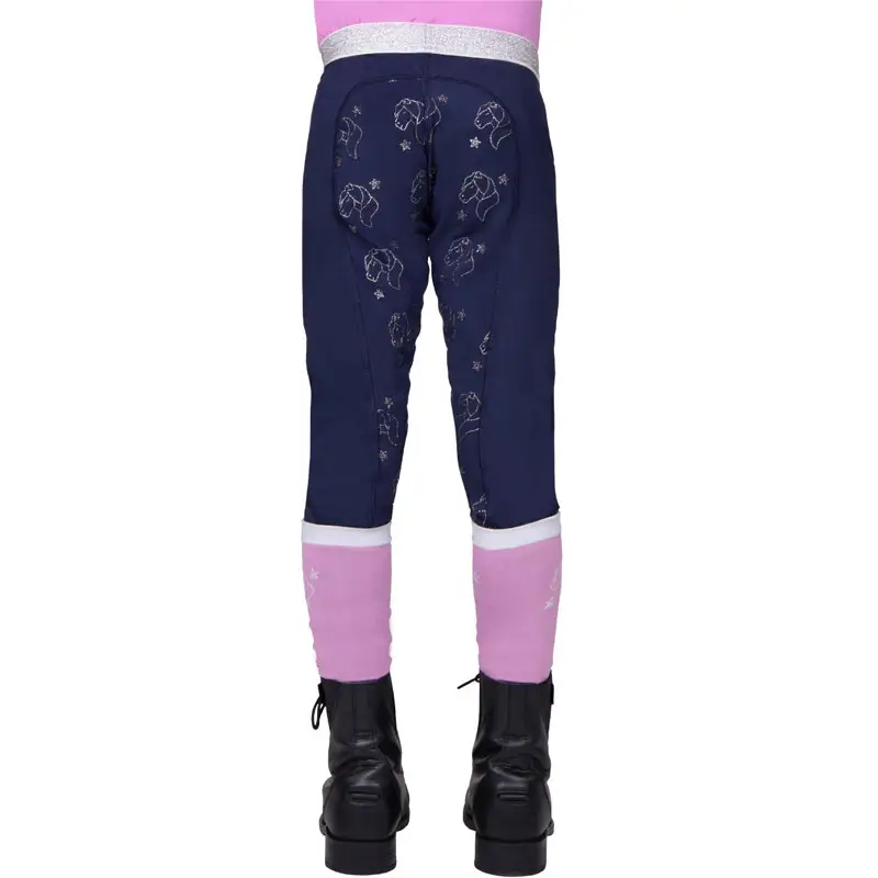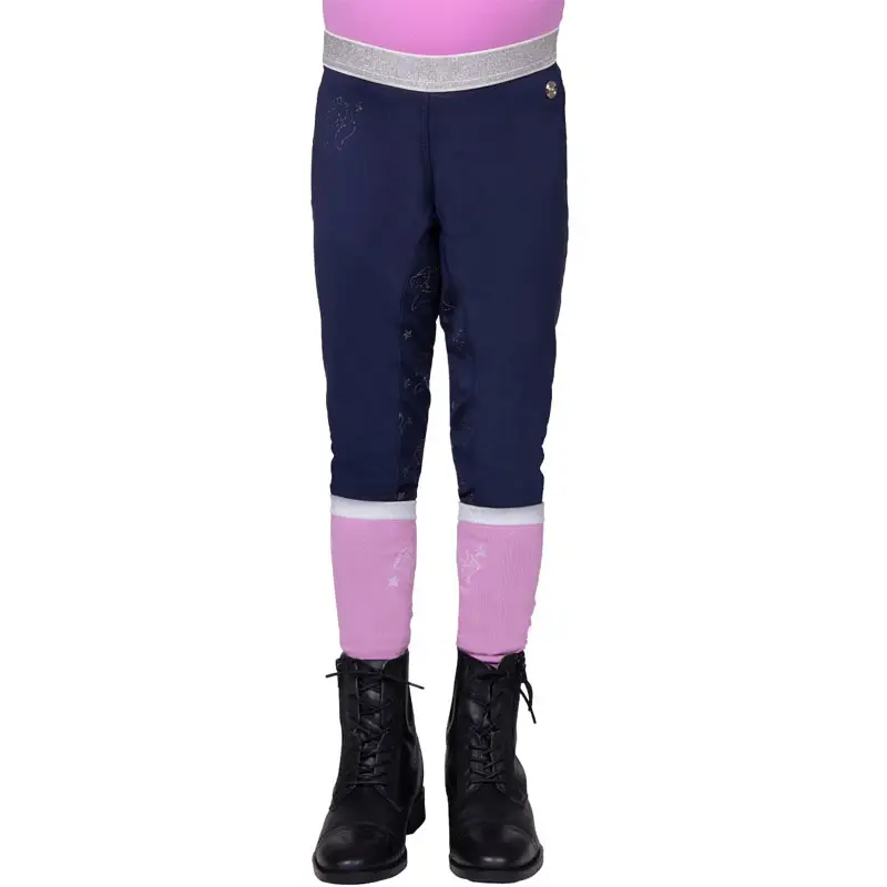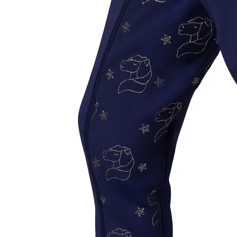 De QHP Rijlegging Gwenn Junior Navy is een kinder rijlegging gemaakt uit comfortabele en elastische stof. De rijlegging heeft een Full Grip zitvlak ontworpen in een leuk patroon en is voorzien van een glitter tailleband.