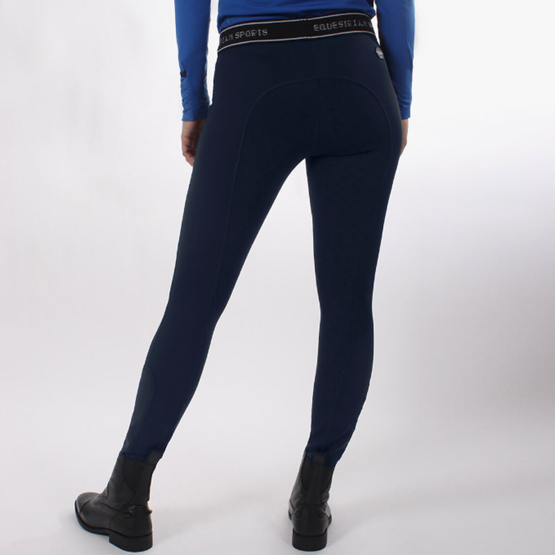 QHP Skye Full Grip Navy gemaakt uit elastische stof met siliconen zitvlak. De rijlegging heeft een elastische band afgewerkt met “Equestrian Sport” tekst en is voorzien van een mobiele telefoonzak op het been.