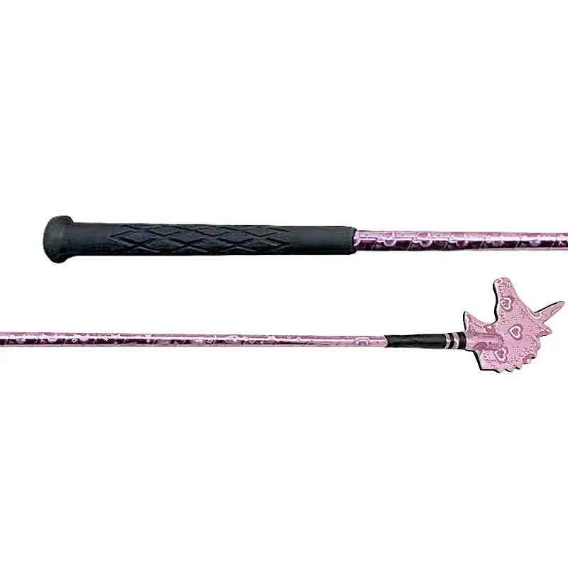 Leuke roze zweep voor kinderen waarvan de stok afgewerkt is met hartjes met een unicorn als flapje aan het uiteinde.