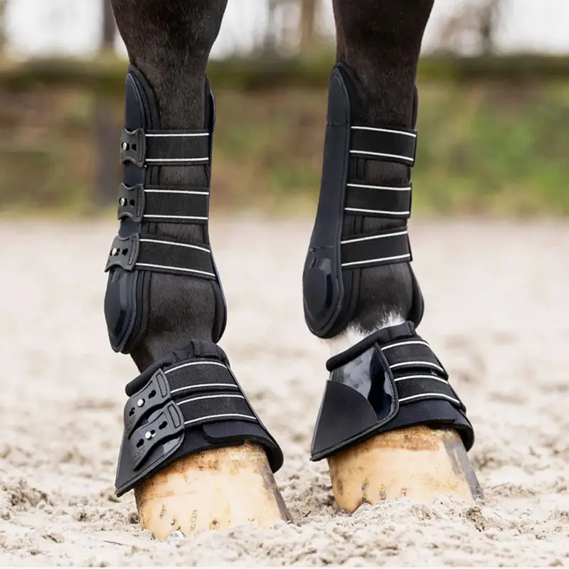 QHP Springschoenen Champion met elastische snelsluitingen en een verharde buitenzijde voor extra bescherming. De ‘no-twist’-knop aan de binnenzijde volgt de contouren van de paardenvoet waardoor de springschoen goed op de plek blijft. Geschikt voor bijvoorbeeld voor springen en cross country.