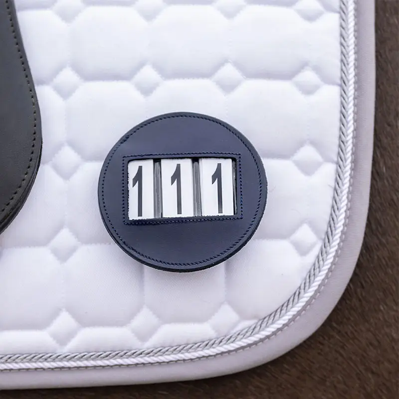 QHP Startnummer Modeste Rond navy vervaardigd uit leder en gemakkelijk te bevestigen aan het hoofdstel of aan het dekje met een veiligheidsspeld of klittenband. De nummerhouder wordt compleet geleverd met nummers.
