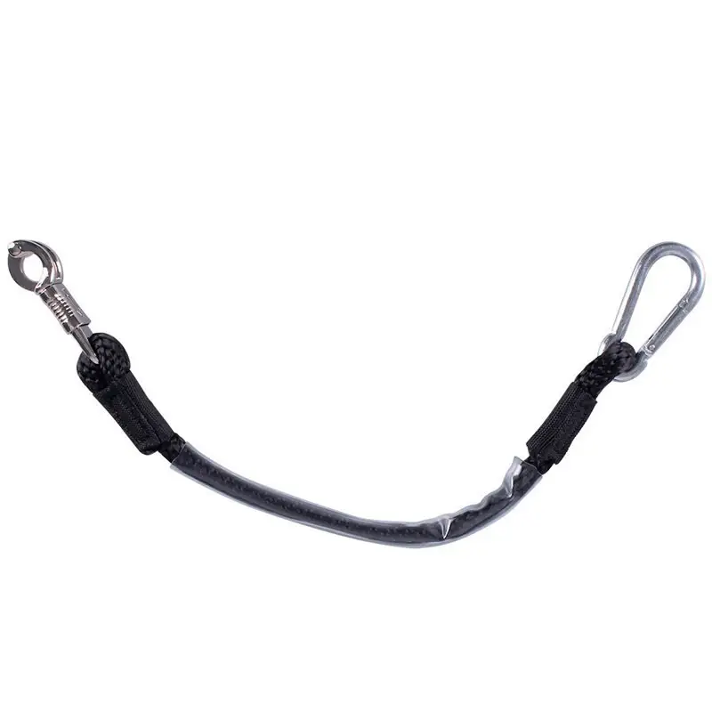 Sterke QHP trailerlijn 90 cm vervaardigd uit touw bekleed met transparant pvc. De trailerlijn is voorzien van karabijnhaak voor bevestiging aan de trailer of voor bijvoorbeeld in de spuitplaats. De paniekhaak aan het uiteinde wordt gebruikt voor bevestiging aan het halster, zodat deze ten aller tijden in het geval van nood kan losgehaald worden.