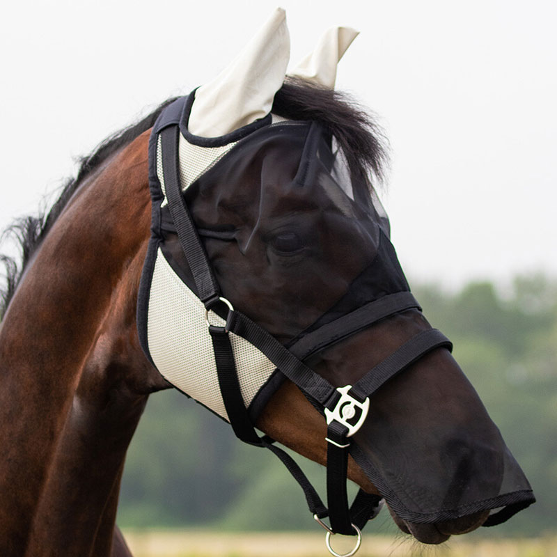 Het QHP vliegenmasker met afneembare neusflap Beige is vervaardigd uit stevig mesh materiaal met oren gemaakt uit elastaan wat zorg draagt voor een hoog draagcomfort. Het overige gekleurde gedeelte is gemaakt uit ademend materiaal waardoor het paardenhoofd tijdens warme temperaturen niet teveel opwarmt.