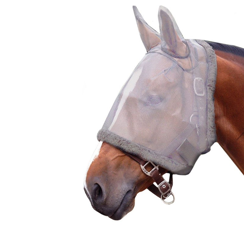 Vliegenmasker met oren van het merk QHP rondom afgezet met imitatiebont. Het masker is te bevestigen door het gebruik van klittenbandsluiting.