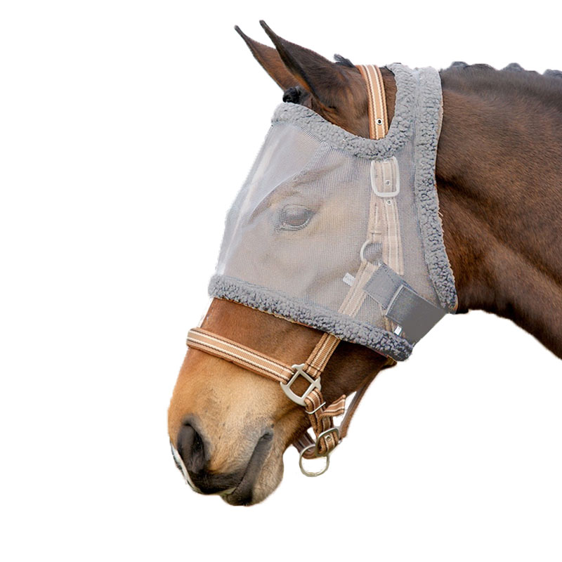 Vliegenmasker zonder oren van het merk QHP rondom afgezet met imitatiebont. Het masker is te bevestigen door het gebruik van klittenbandsluiting.