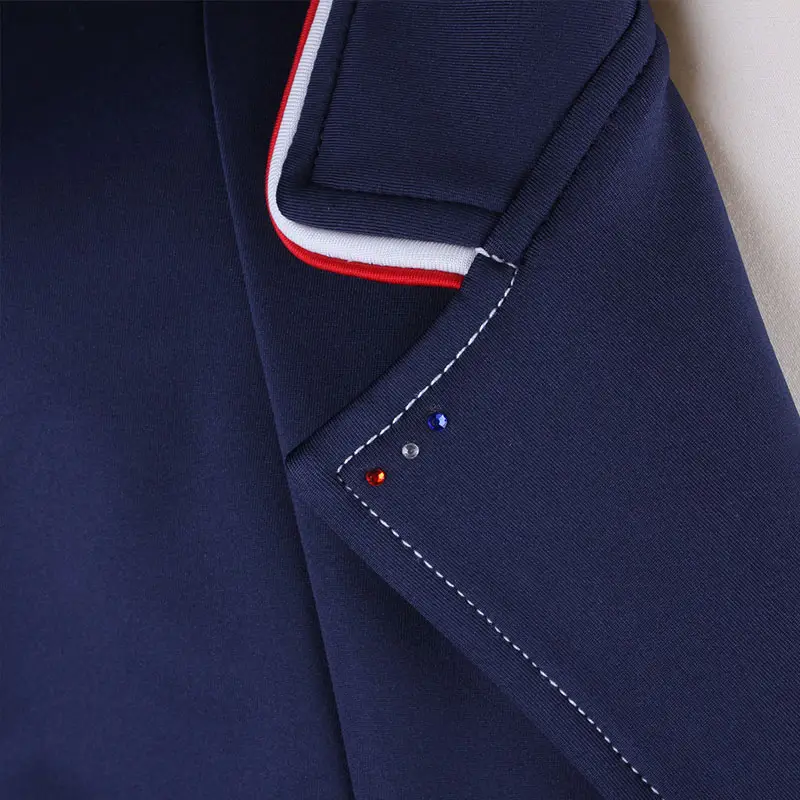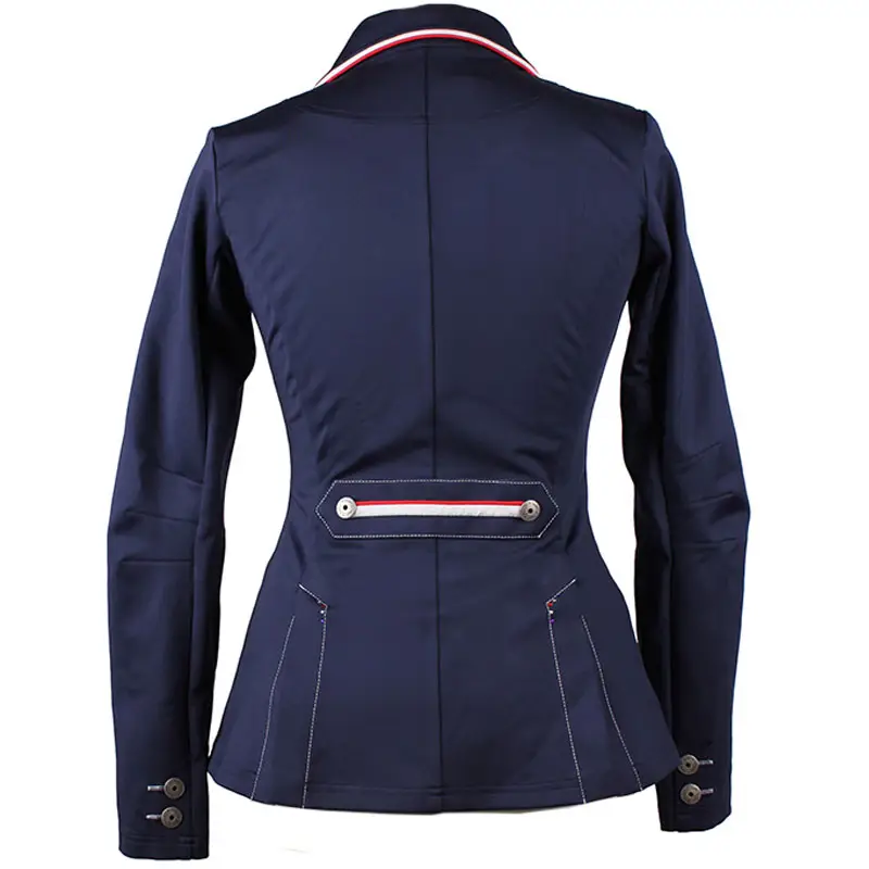 Comfortabel softshell rijjasje voor dames van het merk QHP. Het jasje is sportief en uitgevoerd met verborgen ritssluiting onder de knoopsluiting, witte piping op de kraag, zakken en achterzijde, contrast stiksels, klepzakjes en strass steenjes op de revers, zakjes en split.