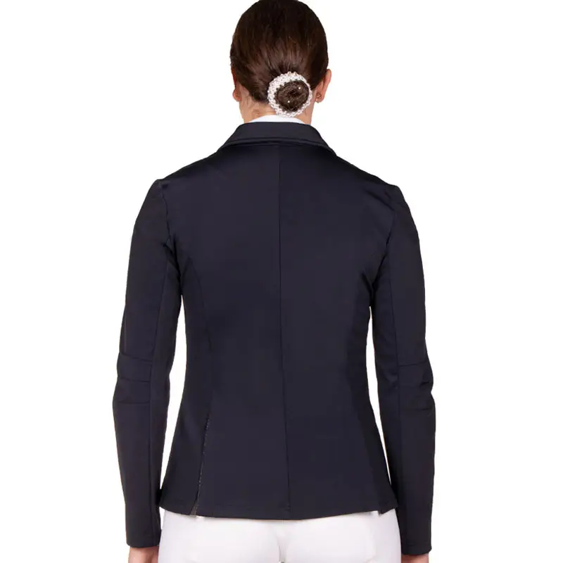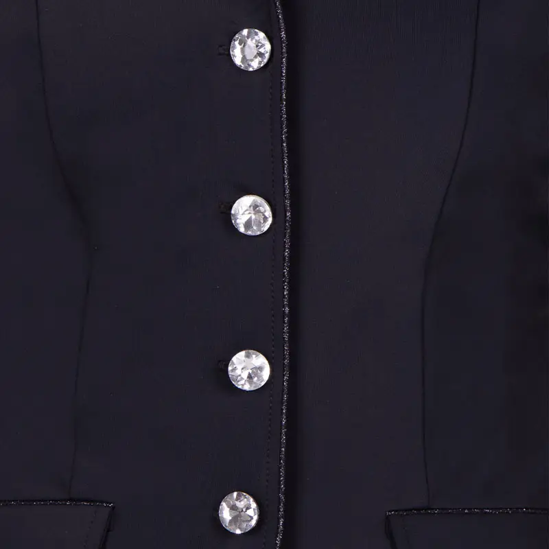 De QHP wedstrijdjas Elaina kids is een elegant en sportief rijjasje gemaakt uit softshell. Het jasje voelt comfortabel aan door de 4-weg elastisch stof. Het betreft een kort model westrijdjasje afgewerkt met glitter piping en crystal knopen. Het jasje is tevens voorzien van klepzakjes aan de voorzijde, dubbele split aan de achterzijde en heeft een QHP badge op de punt aan de voorzijde van de kraag.