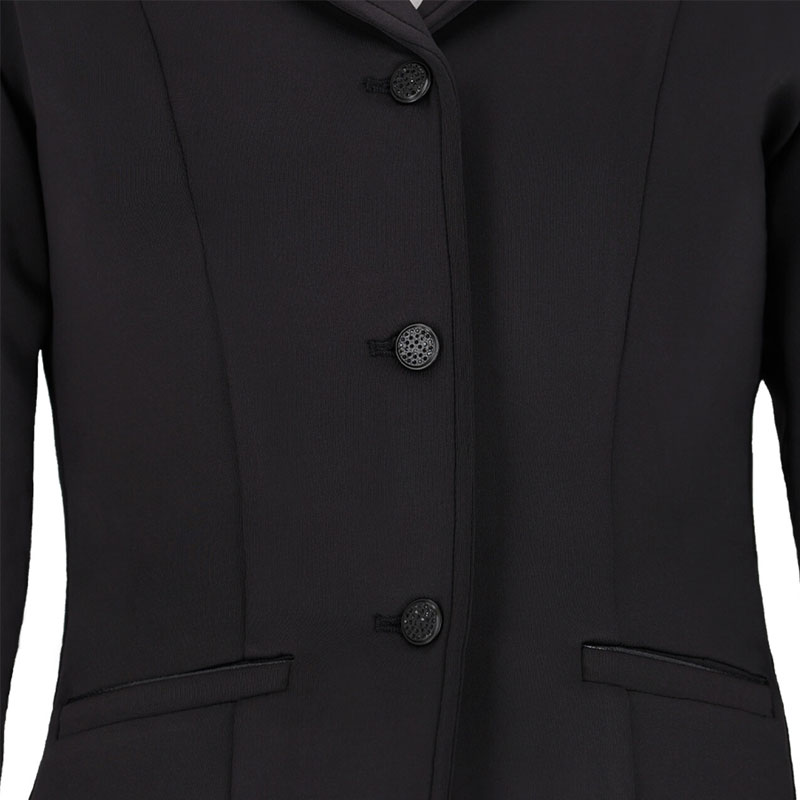 De QHP wedstrijdjas Izebel Junior is gemaakt van een ademende 4-weg stretch stof. De kraag en de zakken zijn voorzien van een glitterrand. Dit in combinatie met de glitter knopen draagt zorg voor een chique look.