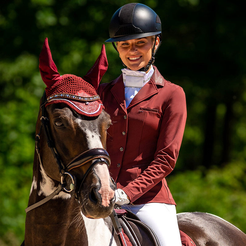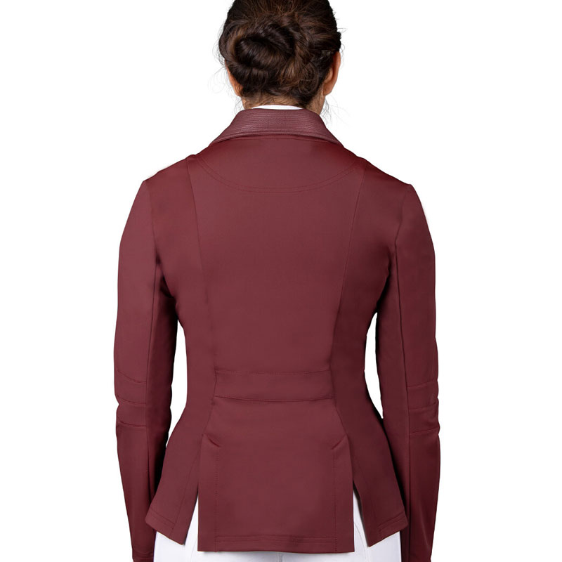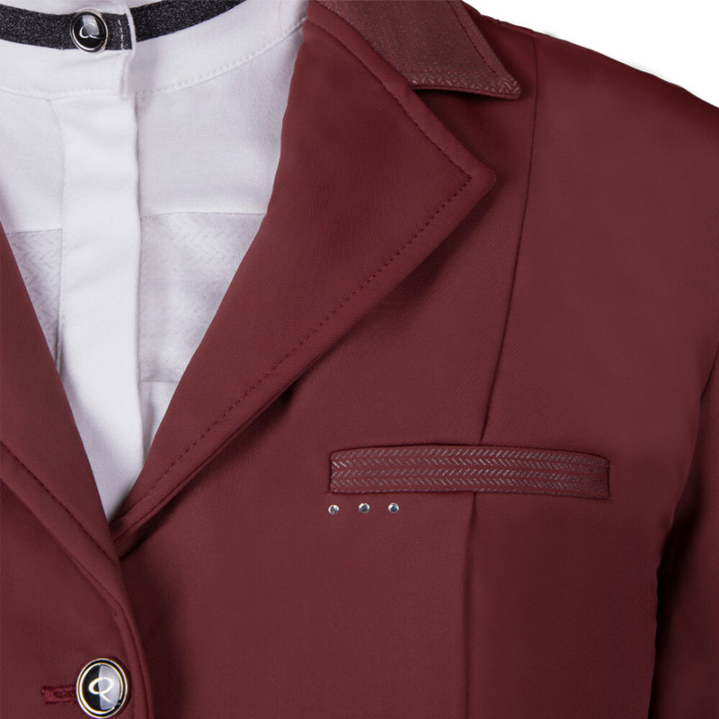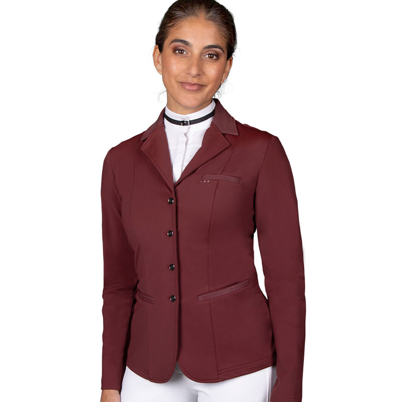 De QHP wedstrijdjas Kae Bordeaux voor dames heeft een chique uitstraling door de subtiele print op de zakken en op de kraag. Het jasje is voorzien van een dubbele split aan de achterzijde en is vervaardigd uit een luxe ademende elastische stretchy stof.