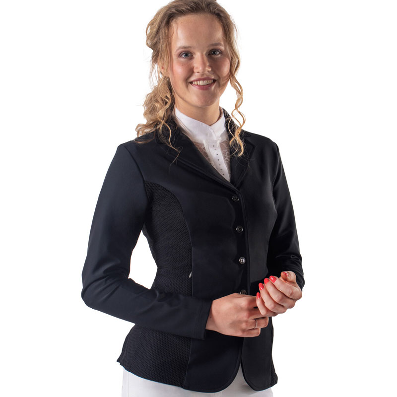 De QHP wedstrijdjas Noven Zwart is een sportief dames wedstrijdjasje vervaardigd uit softshell in combinatie met mesh gedeelte aan beide zijde, onder de armen, op de rug en op de kraag. Door het gebruik van mesh is dit jasje zeer lucht doorlatend wat perfect is voor in de zomer. Het jasje heeft knoopsluitingen met een verborgen ritssluiting en twee zakken met verborgen ritssluitingen.