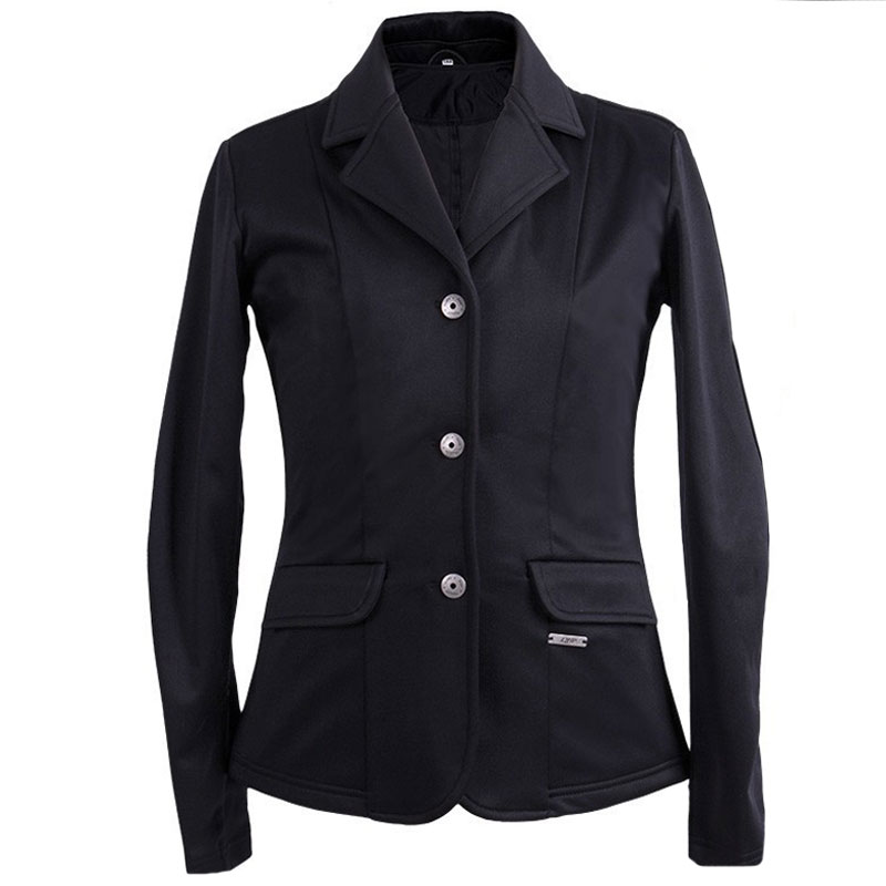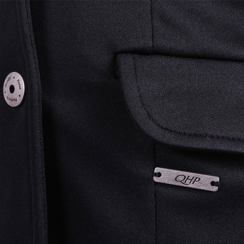 Standaard kinder wedstrijdjasje uit de QHP collectie. Het jasje is vervaardigd uit een licht stretchende stof en is voorzien van knoopsluiting, klepzakjes en een dubbele split aan de achterzijde. Onder het linker klepzakje is het jasje afgewerkt met een metalen badge met QHP logo.