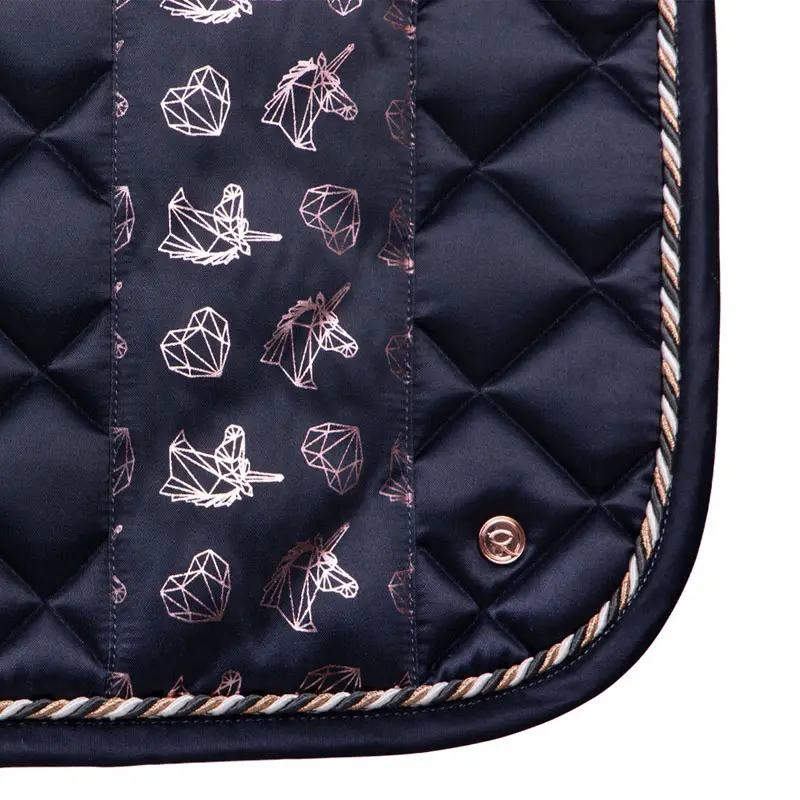 Het QHP zadeldek Didygrijs is een leukje dekje voor kinderen en hun pony. Het dekje is afgewerkt met een eenhoorn print en is gedecoreerd met een tweekleurig sierkoord langs de rand.
