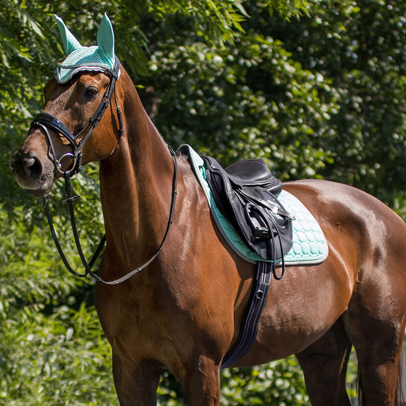 Zadeldek afgewerkt met dubbele koordpiping en contrast gekleurde bies rondom. Het zadeldekje heeft een anatomisch gevormde rugnaad en is voorzien van een vochtregulerende voering.