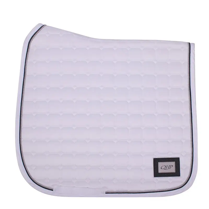 Luxe anatomisch gevormd zadeldekje van het merk QHP afgewerkt met dubbele koordpiping en schitterende QHP badge op de linker zijde. Het dekje is voorzien van een vochtregulerende wafelvoering en singellussen.