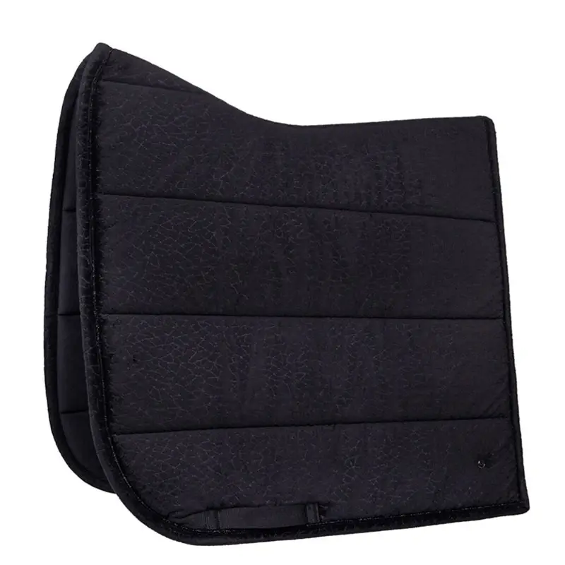 In Croco uitgevoerde QHP zadelpad Julin Zwart. Dit fluwelen dekje is vervaardigd uit sneldrogende stof in combinatie met een sneldrogende mesh voering. Het dekje is anatomisch gevormd en is afgewerkt met een glinsterende koordpiping rondom en “Q-pin” op de linker zijde.